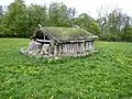 From the beach the trail leads back west through the forest past reconstructed houses including The Tustrup House. The original house was located in the town of Tustrup on the peninsula of Djursland north of Aarhus. This house was probably used for religious ceremonies and perhaps for storing dead bodies until all that remained was bones, which could then be placed in a passage grave or stone barrow.[14] The Prehistoric Trail ends back at the Manor, which nowadays houses the museum administration, Aarhus University offices and student facilities. There is no public access to these buildings. However just across the road is the last point of interest on The Prehistoric Trail, the reconstructed stave church from a town about 35 km to the north of Moesgaard.[15]