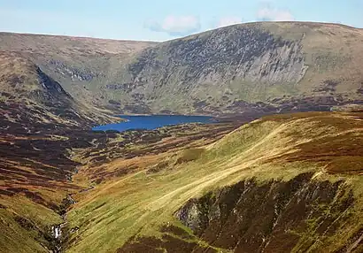 The hills around Loch Skeen[21] offer classic geological features of international interest. Loch Skeen has also been used successfully[22] to try to preserve the endangered species of fish called the vendace[23] which has a history in Britain going back to glacial times. There were vendace in the Lochmaben Lochs until as recently as 1963. As these lochs silted up and the vendace were threatened an unsuccessful attempt was made by Dr Peter Maitland of Stirling University to transfer some to Loch Trool in the Galloway hills before they became extinct.[24]