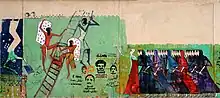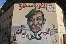 This graffiti has included slogans of the Egyptian revolution, demands for the handover of power to civilians and an end to military rule. Qur'anic verses were also painted onto the walls in response to the rise of the Muslim Brotherhood, condemning sins such as pride, power-seeking and hypocrisy.[6] Artists have used this space to create critical and comical renditions of authority figures, such Lieutenant Mahmoud Shinawi[7] or the famous depiction of Field Marshal Tantawi and President Hosni Mubarak, as well as images celebrating revolutionary figures such as Sambo, Mina Danial and Sheikh Emad Effat.
