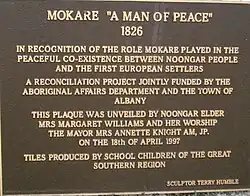 A park consisting of native bushland on the northern side of Mount Melville in Albany was named after Mokare in 1978.[3] A statue was erected in Alison Hartman Gardens on York Street in the centre of Albany in 1997 as part of a reconciliation project.[4]