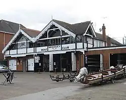 The Molesey stretch allows a 4.5 km navigation from main weir to main weir and is shared with two other boat clubs, the Sunbury Skiff and Punting Club and the Millennium Boat House of Hampton and Lady Eleanor Holles Schools.[6] The second non-tidal reach above Teddington Lock, banks lack the funnelling walls at many points along the widening reach below, factors which lead to fewer waves on windy days. The club has organised or been the main supporting club for the organising of Molesey Regatta since it was founded, a year after the club.[7]