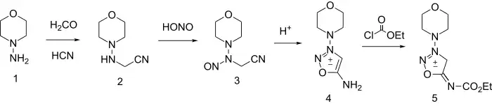Its synthesis starts by reacting 1-aminomorpholine with formaldehyde and hydrogen cyanide to give 2. Nitrosation gives the N-nitroso analog (3) which cyclizes to the Linsidomine (4) on treatment with anhydrous acid. Formation of the ethyl urethane is then made possible by reacting linsidomine with ethyl chloroformate.
