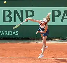 Barthel began her clay-court season at the Porsche Tennis Grand Prix. She reached the qualifying round where she lost to Ajla Tomljanović.[76] However, she got a lucky loser spot in the main draw. In the first round, Barthel lost to fifth seed Jelena Janković even though she had several match points against the Serb.[77] Barthel then lost in the 2nd round of qualifying at the Portugal Open to Kiki Bertens and at the Mutua Madrid Open to Petra Cetkovská. Barthel qualified for the Italian Open defeating María Teresa Torró Flor and Virginie Razzano. In the first round, she lost to thirteenth seed Carla Suárez Navarro.[78] Before the French Open, Barthel competed at the Nürnberger Versicherungscup. She defeated Belinda Bencic in the first round.[79] In the second round, she beat eighth seed Annika Beck[80] before losing in the quarterfinals to fourth seed Elina Svitolina.[81] Barthel had a good run at the French Open. She beat Karin Knapp in her opener.[82] She advanced to the third round when compatriot and sixteenth seed Sabine Lisicki was forced to retire with a wrist injury.[83] In the third round, Barthel lost to French wildcard Pauline Parmentier.[84]