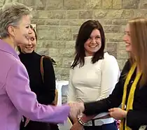 Governors General make regular visits to Saskatoon, though at greater intervals than their provincial counterparts. Governor General Adrienne Clarkson twice visited, selecting Saskatoon for her urban visits programme through which she sought to dialogue with urban citizens "about innovations and ideas that can be shared with other municipalities to make cities desirable places to live".[17] On this visit, Clarkson hosted a youth roundtable, literary forum and awards presentation, and also met with aboriginal elders. A visit by Roméo LeBlanc included a hospital, senior citizens centre and aboriginal heritage park, another by the Duke of Devonshire included a primary school, and another by the Duke of Connaught included a riverfront cathedral. Former Saskatonian and Governor General Ramon Hnatyshyn was schooled at local grade schools and at the University of Saskatchewan. He is credited with popularising his office on re-opening the vice-regal residence to the public, encouraging artistic development, supporting education and strengthening multiculturalism. Governor General the Earl of Minto visited in 1901, the year Saskatoon was incorporated as a village, and each of his successors have since visited. Their visits include that of Earl Grey in 1906, the Duke and Duchess of Connaught and Princess Patricia in 1912, the Duke of Devonshire in 1917, with the Duchess of Devonshire in 1918, 1919 and 1921, Lord and Lady Byng in 1922 and 1926, the Viscount and Lady Willingdon in 1929, the Earl and Countess of Bessborough in 1932 and 1935, Lord Tweedsmuir in 1938, the Earl of Athlone and Princess Alice, Countess of Athlone in 1941, the Viscount and Lady Alexander in 1946 and 1948, Vincent Massey in 1952 and 1957, Georges and Madame Vanier in 1960 and 1965, Roland Michener in 1968, Jules Léger in 1975, Edward and Mrs. Schreyer in 1979 and 1982, Jeanne Sauvé in 1984, Ramon and Mrs. Hnatyshyn in 1990, Roméo and Mrs. LeBlanc in 1995 and Adrienne Clarkson in 2000 and 2004.[18] Several Governors General are remembered in street, neighbourhood and primary school names, and also in the name of the celebrated Delta Bessborough hotel.