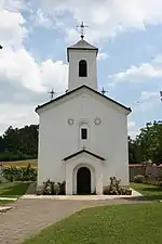There is a famous Monument to Serbian insurgents of the First Serbian Uprising, participants in the Battle of Čokešina. According to the legend, the monastery is the endowment of Miloš Obilić. The monastery, like the village, is named after Bogdan Čokeša,[3] a former landowner from Mačva. In 1458, it became the property of the great nobleman Stefan Ratković, and two preserved stone slabs on the floor of the church date from that time. In the period from 1707 to 1732, after the great migration under Patriarch Arsenije Čarnojević, there was a school in the monastery headed by Abbot Vasilije. The Turks then set fire to and demolished the monastery. On the old foundations in 1786, a new church was built, which was demolished again during the First Serbian Uprising when the battle between Serbs and Turks took place there, known as the Battle of Čokešina. A monument with a tomb was erected in the monastery gate in memory of the Serbian insurgents.[4][5]