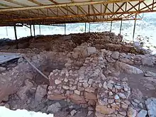 The site may have been a Minoan palace, and has thus far yielded a complex of buildings, including storehouses, two archive rooms of earthenware stamps and sanctuaries.