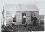 The claim of Moncena and Lois Dunn was staked on April 16, 1892, just west of Summit, South Dakota. Lois is outside in a full dress, her friend, Celia Johnson, is in the doorway. Son Everett has his hands in his pockets, son Wendell is wearing a smock