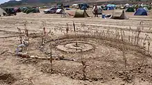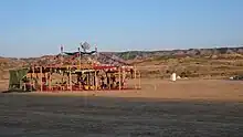 The Monegros Desert is noted for its Monegros Desert Festival, usually held in mid-July,[10] attracting numerous Spaniards and internationally renowned DJs and bands and some 40,000 people to its electronic music performances annually.[11] Formerly called the "Groove Parade" after being founded in 1992, it is held at the Finca Les Peñetes, roughly 18 kilometres (11 mi) west of Fraga, not far from Bujaraloz.[12] It is held in a windowless, graffiti-filled hall called Flarida, with an area of some 3,000 square metres (32,000 sq ft).[12]