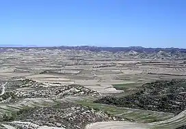 The Monegros Desert spans the provinces of Zaragoza and Huesca in the region of Aragón, including the comarca of Monegros in Huesca.[1] Part of the desert lies in the Ebro Valley. The desert covers about 276,440 hectares (683,100 acres) and consists of 49 villages in 31 municipalities. The highest point of the Monegros Desert is Monte Oscuro, at an altitude of 822 metres (2,697 ft).[2] Much of the landscape topography varies between 200 feet (61 m) and 300 feet (91 m) and is relatively flat semi-desert, with habitats of shrub-steppes prone to frequent droughts with high temperatures with hardly any rainfall (about 350 mm per year / 13.78 inches). Deserted farms and farm houses and juniperous woods are also seen in scattered locations.[3]