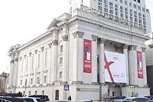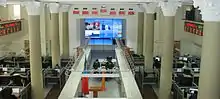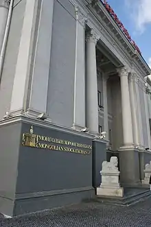 The Mongolian Stock Exchange is located in the former Children's Cinema building near Sükhbaatar Square, next to the headquarters of Mongolia Telecom Company and across from the Mongolian parliament's buildings. It was refurbished at a cost of US$4.5 million prior to the official start of trading; seats and screens were removed, a trading floor was created and equipped with computers, and automatic sinks were installed in the bathrooms.[11][13] The building itself is a pink-and-white neo-classical-style structure.[16] One corner of the building has been partitioned off to serve as an internet cafe.[31] Due to the color of its building, the Financial Times correspondent, Leslie Hook, defined it the pink house of equities.[26] Since then, the building has been painted gray.