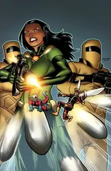 ![]() Monica Rappaccini alongside A.I.M. troops. Textless cover of Ant-Man & Wasp #3 (January 2011). Art by Salva Espin and Guru-eFX. | |