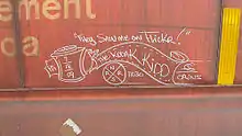 A moniker (also known as a streak, tag, or hobo art) is a piece of graffiti on the side of a freight car on freight trains. Monikers are produced with a solid paint stick, industrial crayon, or a lumber crayon. Monikers serve the purpose for a moniker artist to share stories or a moment in time with others. Many moniker artists have a unique design they produce, and sometimes write the area they are from, or date that the moniker was produced. Occasionally, a short phrase will accompany monikers (this being started by Bozo Texino, famous for his Colossus of Roads moniker). Many of the artists are railroad workers, train hoppers, and railroad enthusiasts.