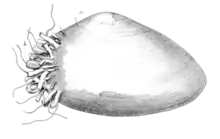 | A colony of hydrozoan Monobrachium parasitum on the Macoma calcarea shell. | |