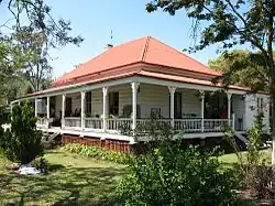 Standing on a grassed knoll, the distinctive white-painted main house consists of the early 1870s core to the north and an L-shaped extension (c.1912) to the south. Timber framed and sheltered by hipped and gabled roofs clad with red painted corrugated iron, the house stands on low timber stumps. Once entered through the main entrance door to the north and organised around a central hall, the house now functions as a series of rooms operating off verandahs which run around the west, north and east of the house. A recently enclosed verandah to the south functions as an informal entrance.[1]