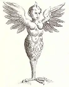 Analyzing the later account of Ambroise Paré, Walton et al. proposed a tentative diagnosis of sirenomelia with related factors;[lower-alpha 2] additionally, they emphasize possible indicators of hydrocephalus causing a bulging anterior fontanelle, radial hypoplasia with pterygium to give the impression of wings, and caudal regression, the latter of which may have been caused by diabetes mellitus in the mother.[21] The "horned" forehead can alternatively be considered an instance of cyclopia.[22] Finally, it is plausible that some of the more vivid features were caused by Roberts syndrome, which could have affected the development of the limbs and genitals.[4]