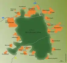 The Montabaur Heights (German: Montabaurer Höhe) are a 10 to 15 kilometre long, mostly wooded hill ridge in the southwestern Westerwald in Germany and lies mainly within the county of Westerwaldkreis. The ridge is geographically classified as sub-natural region 324.1 of the Lower Westerwald (major unit 324) and has its highest hill, the 545.2 m above sea level (NHN)[1] Alarmstange, whose summit rises six kilometres west of the town of Montabaur and about 12 km northeast of Koblenz.