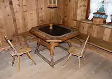 The Montafon table was a typical piece of furniture in a Montafonerhaus. This has an inlaid octagonal (4 broken corners) table top with a slate inlaid in the centre and stands on sloping feet. The slate was used to put down hot pots and as a writing board for the card game Jassen. The Montafon table includes a corner seat, chairs and a Herrgottswinkel above the corner seat with a cross and two votive images.[1]
