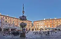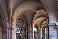 The Place Nationale is a square of the 17th century, entered at each corner by gateways giving access to a large open space surrounded by pink brick houses supported by double rows of arcades.