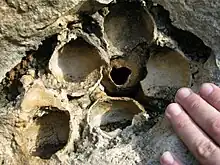 In particular inside one of these quarries (now Geosite Travertino della Cava Cappuccini (Alcamo)), they have found remains (a natural cast of the brain, defences and molar teeth) of the dwarf elephant,[3][4] Elephas falconeri,the spheric eggs and the fossilized armour of a big tortoise (Geochelone sp.).[5] These last two fossil findings are kept at Museo paleontologico e geologico di Palermo "Gaetano Giorgio Gemmellaro".[6] The site has also allowed to re-establish the correct "stratigraphy" of the Elephas in Sicily because, in a fracture of travertine filled with "paleosuolo" (then more recently than travertine itself), they have found the remains of a medium size elephant, the Elephas mnaidriensis,[7] which had been wrongly considered the dwarf elephant’s ancestor.