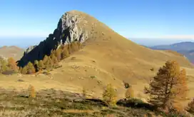 The mountain stands on the ridge dividing the small valleys of Rio Sbornina and Rio Sotto Crosa, both tributary of the Corsaglia. The ridge starts from Cima della Brignola, descends till to the Bocchino della Brignola (2.276 m), rises again up to Cima Ferlette and follows with the del Punta Lusco (2.277 m) and Monte Fantino, ending at the confluence between the two streams, close to the "Stalle Buroch" ("Buroch's stables").[1] Monte Fantino summit is marked by a cross; its prominence is 161 m.[2] The east side of the mountain features steep and even grassy slopes, while its NW face overhangs rio Sbornina valley with a rocky wall of almost 500 metres drop.[3] Administratively the mountain belongs to the comune of Frabosa Soprana.
