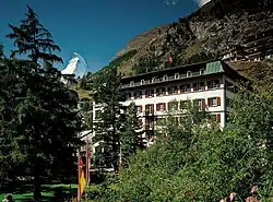 The Monte Rosa is a hotel, located in the main street of Zermatt. It was frequented by the members of the Alpine Club, including Edward Whymper who made the first ascent of the Matterhorn in 1865. The hotel is named after the highest mountain near Zermatt, Monte Rosa.