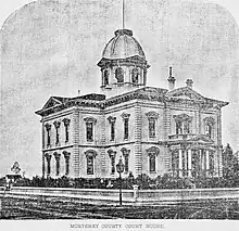 The first Monterey County Court House was built in 1878, designed by Jacob Lenez, Jr., which was a brick Victorian building. The courthouse remained in use until 1937, when it was demolished. Today a courtyard, lily pond, and commemorative sculpture occupy the site.[2][3][4]