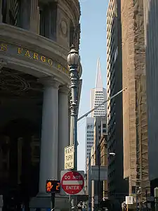 Looking north from Market Street up Montgomery Street towards the Transamerica Pyramid. In the foreground is the flagship branch of Wells Fargo Bank.