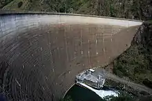 Monticello Dam is a 304-foot (93 m) high concrete arch dam in Napa County, California, United States, constructed between 1953 and 1957. The dam impounded Putah Creek to create Lake Berryessa in the Vaca Mountains.