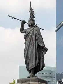 The monument is topped by a statue of Cuauhtémoc, wearing ceremonial clothing with a penacho (plumed headdress) and holding a spear, made by the Mexican sculptor Miguel Noreña. The costume and the anatomical arrangement of Cuauhtémoc - made to resemble statues of the Greco-Roman tradition, following the artistic fashion of the time. The tilmàtli (outer garment) is knotted the Roman style, for example. According to Arturo Arnaiz y Freg, poet Ignacio Manuel Altamirano was the model for the Cuauhtémoc face.[6]