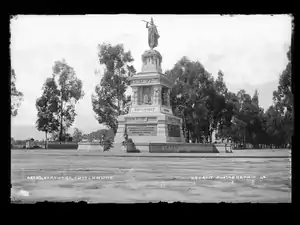 The construction of the monument was part of a nationalist discourse, promoted through a program of public sculpture and an expansion of the Paseo de la Reforma.[1][2] Its construction occurred subsequent to the Monument to Christopher Columbus, located at the next major roundabout (glorieta) of the same wide avenue, and in contrast to it, as an attempt to highlight the mestizo (mixed origin) identity of contemporary Mexico.[1] It is also deliberately made in the same scale as monuments celebrating national heroes from the 19th Century Mexican War of Independence.[3] Alongside the Mexico Pavilion at the 1889 Paris exhibition by Antonio Anza, the monument was part of a failed search for a purely Mexican artistic style.[4]