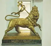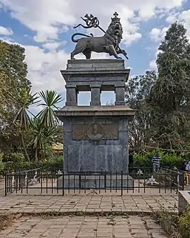 The monument is located in the square of the Addis Ababa railway station in Addis Ababa and marks the end of Winston Churchill Avenue, one of the main arteries of the city.[3] The sculpture of the Lion of Judah, in gilded bronze, is placed on a black granite pedestal decorated with relief portraits of emperors Menelik II and Haile Selassie, Empress Zewditu, and Ras Makonnen Wolde Mikael. The work was made by the French sculptor Georges Gardet in 1930, on the occasion of the coronation of Emperor Haile Selassie on 2 November 1930. After the 1974 revolution, the Derg regime thought of removing the monument, a symbol of the monarchy. However, an association of Arbegnoch veterans claimed that it was a memory of Ethiopian antifascist resistance and a symbol of Ethiopia. Therefore, the regime agreed to leave the monument, which is still in front of the Addis Ababa central station.[4] In 1954, a new monument was commissioned by Emperor Haile Selassie from sculptor Maurice Calka, around the National Bank of Ethiopia and the National Theater.[5]