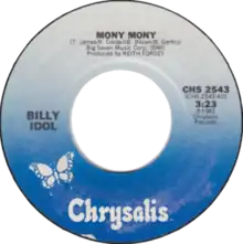 British rock artist Billy Idol released a cover version in 1981 (on the Don't Stop EP). Along with the track "Baby Talk", Idol's version of "Mony Mony" went to No. 7 on the Billboard dance chart.[21] In his 2015 memoir, Dancing With Myself, he recalls his affection for the song originally stemmed from a sexual encounter he had as a youth where it played in the background.[22] Before proposing the cover to executives at Chrysalis Records, he originally suggested recording a cover of "Shout" before admitting his intentions for "Mony Mony".[22] A live recording of the song became a hit for Idol in 1987 as well, while promoting his then-forthcoming compilation work Vital Idol. The live version was released as a single and went to No. 1 on the Billboard Hot 100, coincidentally displacing Tiffany's cover of another Tommy James song, "I Think We're Alone Now", from the top spot. It also finished directly behind the Tiffany song at No. 19 in the 1987 year-end Billboard chart.