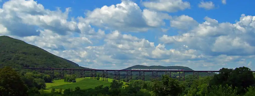 The bridge was constructed between 1906 and 1909 by the Erie Railroad as part of its Graham Line freight bypass, and was opened for service in January 1909. The trestle spans the valley for 3,200 feet (975 m) and is 193 feet (59 m) high at its highest point, making it the second-highest and -longest railroad trestle east of the Mississippi River (after the 1889 Poughkeepsie Bridge of the New York, New Haven and Hartford Railroad, which is 6,768 ft (2,063 m) long and 212 ft (65 m) high). Apart from the valley below, the viaduct crosses two roads (Otterkill Rd. and Orrs Mills Rd.), the Moodna Creek, and the Erie Railroad's now-abandoned Newburgh Branch. The open design of the trestle was used to reduce wind resistance and is a major reason why the trestle is still in service today.[2]