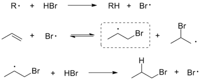 Kharasch, in his seminal 1933 paper entitled "The Addition of Hydrogen Bromide to Allyl Bromide", proposed that the anti-Markovnikov addition of HBr to allyl bromide to yield 1,3-dibromopropane was due to the presence of peroxides. He termed this the "peroxide effect", which he proposed proceeds through a free radical chain reaction addition. Elsewhere in the literature, other examples of anti-Markovnikov additions were observed by Whitmore and Homeyer as well as Sherril, Mayer and Walter, all of whom rejected Kharasch's conclusions. They instead argued that the direction in which the reaction proceeds is determined not by the presence or absence of peroxides, but by the nature of the solvent in which the reaction is taking place. In this paper, Kharasch analyzed one at a time the effects of temperature, solvent, and light on the direction in which the reaction proceeded. He concluded that the presence of peroxides was the driving force for anti-Markovnikov addition and that any changes in temperature, solvent, or light affected the orientation of addition only through the chemistry of the peroxides.