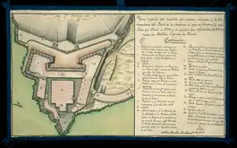 Two days later a British detachment landed at Torreón de la Chorrera, on the west side of the harbour. Meanwhile, Colonel Patrick Mackellar, an engineer, was overseeing the construction of the siegeworks against the Morro.[22] Since digging trenches was impossible, he resolved to erect breastworks instead.[23] He planned to mine towards a bastion of the Morro once his siege works would have reached the ditch and to create a runway across this ditch with the rubble produced by his mining activities.