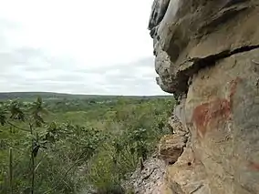 The Morro do Chapéu State Park is in the municipality of Morro do Chapéu, Bahia. It has an area of 46,000 hectares (110,000 acres).[2] The park is in a part of the Chapada Diamantina which has great scenic beauty and potential for tourism.[3] The park contains sub-basins of the Salitre, Jacaré, Utinga and Jacuípe rivers. These in turn feed the Paraguaçu and São Francisco rivers.[4] 543 important springs have been catalogued, and the site has potential to function as a geopark.[5] It also contains archaeological sites with cave paintings.[6] The paintings in the Brejões, Boa Esperança, Igrejinha and Cristal caves demand special protection.[5]