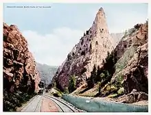 One of the most notable features of Morrow Point is the famed Curecanti Needle, a striking 700-foot (210 m) tall granite spire on the reservoir's southern shore. Located immediately west of the mouth of Blue Creek and directly across from the mouth of Curecanti Creek, the Needle was a well-known landmark to generations of rail travelers, who passed near to the spire on the Denver & Rio Grande Western's Black Canyon route between Gunnison and Montrose. Though difficult to access, the Needle is popular with climbers, who must either use a boat or cross the frozen lake in winter to reach the base.[5]