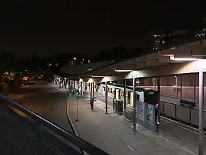 Mortensrud is a rapid transit station on the Østensjø Line of the Oslo Metro. It is located in Mortensrud in the Søndre Nordstrand borough of Oslo, Norway. Construction of the station started in 1995, which was taken into use on 24 November 1997, when it became the terminal station of the line—following a 2.4 kilometres (1.5 mi) extension from Skullerud. The extension cost 215 million kr to build, and most of the section is in tunnels. The station is built in concrete, wood and stone, and cost NOK 35 million. It is served by line 3, in addition to being an important bus terminal for the borough, including a feeder service to Bjørndal. Travel time along the 13.6-kilometre (8.5 mi) section to the city center is 24 minutes. In 2001–02, the station had 2,077 daily boarding passengers. The station serves the surrounding residential area, as well as an adjacent shopping center. South of the station is a turning line for trains.