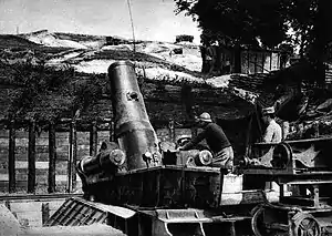 For transport, the mle 1914 could be placed on convertible gauge rail bogies which allowed the mortar to be moved long distances over standard-gauge rails and narrow-gauge rails for the last leg of the journey from the rail station to its firing position. These narrow gauge tracks were also used to re-position the mortars and bring up their ammunition and supplies. Later in the war road wheels which allowed the mortars to be towed by a traction engine were developed. The mortar was transported in 3 loads: The barrel, the carriage, and the firing platform.[2] Each part was transported on a gantry crane which was suspended between two double-axle narrow gauge bogies. The most time-consuming part of the site preparation included the excavation of a large pit into which the steel firing platform was sunk. The mortar was then assembled by the gantry cranes which ran on two parallel 60 cm gauge tracks laid 7 m (23 ft) apart, perpendicular to the line of fire on each side of the pit.[8] First, the firing platform was lowered into the pit and anchored. This platform had several pilings that were sunk into the ground to absorb some of the mortar's recoil forces. Second, the carriage was brought in and lowered onto and fastened to the base. Lastly, the 9,275 kg (20,448 lb) barrel was lowered onto the carriage. The construction of each part was one simple operation.[2]