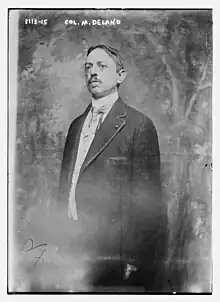 Colonel Mortimer L. Delano was head of the Aero-Military War College of America and the First Aviation Corps and The Aero Military Service Federation of America. Around 1914, he was issuing pilots licenses and selling pilots uniforms and selling military titles.[1][2]