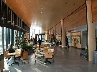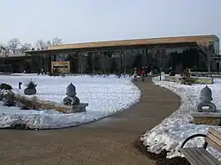 The 36,000 sq ft (3,300 m2) Visitor Center was built in 2004 and designed by David Woodhouse Architects.[21] The building includes wood representing the Arboretum's collections and incorporates sustainable features such as permeable pavers in the parking lots and local fieldstone salvaged from a predecessor building.