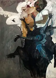 Dimondstein's oil painting “The Attack,” which depicts a "wounded buddy" in a razed German town, was awarded first place by the California Art Club in 1946 at the First Annual G.I. Art Exhibit at the Los Angeles Museum.[11] Attendees were confounded by the simplified color scheme and distorted proportions, and were perplexed that it merited the award. A local news article published after the event speculated that the controversy stemmed from a prevailing lack of appreciation for the significance of simplicity in modern design techniques, which was becoming increasingly evident in the creation of furniture, houses, movie sets, and various objects of the era.[12]