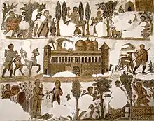 The Mosaic of Dominus Julius is a late fourth-century or early fifth-century floor mosaic that was put into in the estate of Dominus Julius in Carthage.[1] This mosaic is a reflection of daily life and an explicit communication of the status and wealth of the owners, and what their life consisted of.[2] It is composed of three registers (levels), and focuses on an image of a dwelling in the center, surrounded by images of leisurely activities of the owners.