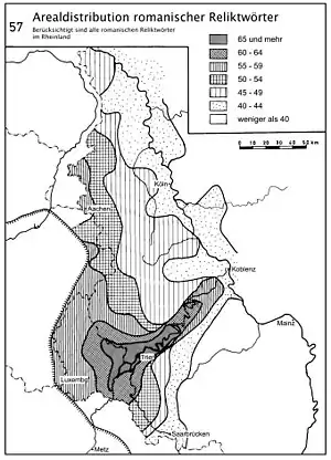 In addition to the Gallo-Roman place and field names, the vocabulary of the Moselle dialects also shows a wealth of Roman influences, which can be viewed as reflexes of the Moselle Roman language island. A quantifying cartographic representation of Romanesque relic word areas shows a clear massing of Romanisms in the middle Moselle area up to the Trier area and the lower reaches of the Saar and Sauer.[6] Examples of such words are : Bäschoff 'back container' < bascauda, Even 'oats' < avena, Fräge 'strawberry' < fraga, Gimme ' 'Bud' < gemma, glinnen 'Glean grapes' < glennare, More 'Blackberry' < morum, pauern 'Most filter ' < purare, Präter 'Flurschütz' < pratarius, Pülpes 'Crownfoot' (plant) < pulli pes etc.[7]