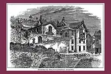 The picture shows the many buildings connected with his business. He built his lodging house, Vale View - now The Churchill Hotel - on the land in the foreground .