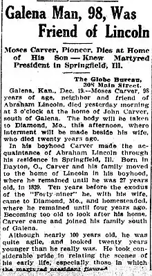 Moses Carver was born in Dayton, Ohio. On August 11, 1834, he married Susan Blue in Springfield, Illinois.[1] He and his brother Richard migrated to southwest Missouri around 1838 from Ohio and Illinois. The Preemption Act of 1841 allowed farmers who lived on and improved 160 acres (0.65 km2) of land for six months to buy the land from the government at a low price. Moses Carver purchased a total of 240 acres (0.97 km2) in Marion Township, Newton County, Missouri.