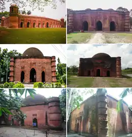 ![]() Clockwise from top: Sixty Dome Mosque, Nine Dome Mosque, Chuna Khola Mosque, Ronvijoypur Mosque, Bibi Begni Mosque and Singair Mosque | |