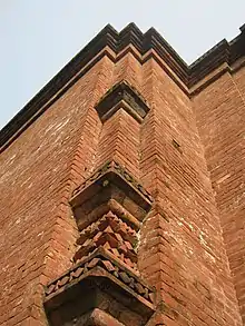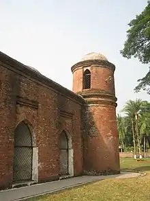 The Chuna Khola Mosque, built in the 15th century, is located in the midst of rice fields in the village of Chuna Khola (named after the limestone extraction that was in vogue here in the past). It has been identified as representing a transition from the Khan Jahan style monuments. It is a 7.7 metres (25 ft) square building with 2.24 metres (7 ft 4 in) thick walls.[16] It has three entrances on the east and one each on the northern and southern sides also. It has three mihrabs with the central mihrab being the largest in size and projecting outwards. It has a hemispherical dome with frontal arches. There are also squinches and half domes. It is distinctly different from the Khan Jahan style mosque in its exterior decorations, particularly the east façade, which depicts four rectangular panels bordered by foliated scrolls with merlons having plant motifs. It has four turrets with curved cornices. The brick walls, in particular, were damaged due to sulphate effect. It was renovated in the 1980s according to guidelines set by UNESCO.[4]