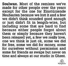 - ↑ Full title: Most of the remixes we've made for other people over the years except for the one for Einstürzende Neubauten because we lost it and a few we didn't think sounded good enough or just didn't fit in length-wise, but including some that are hard to find because either people forgot about them or just simply because they haven't been released yet, a few we really love, one we think is just ok, some we did for free, some we did for money, some for ourselves without permission and some for friends as swaps but never on time and always at our studio in Ghent.
