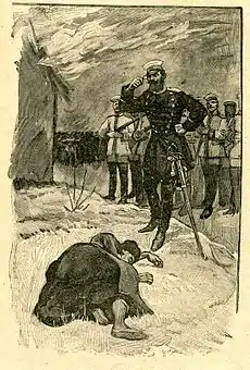 The other villagers and soldiers rush to her home, and a German officer interrogates Mother Sauvage. She informs him that the soldiers were in the fire and that she started the fire. She hands the officer the list of names and addresses she had gathered and is immediately pushed against her home and shot "almost in two", with the letter informing her of her son's death bloody in her hand.